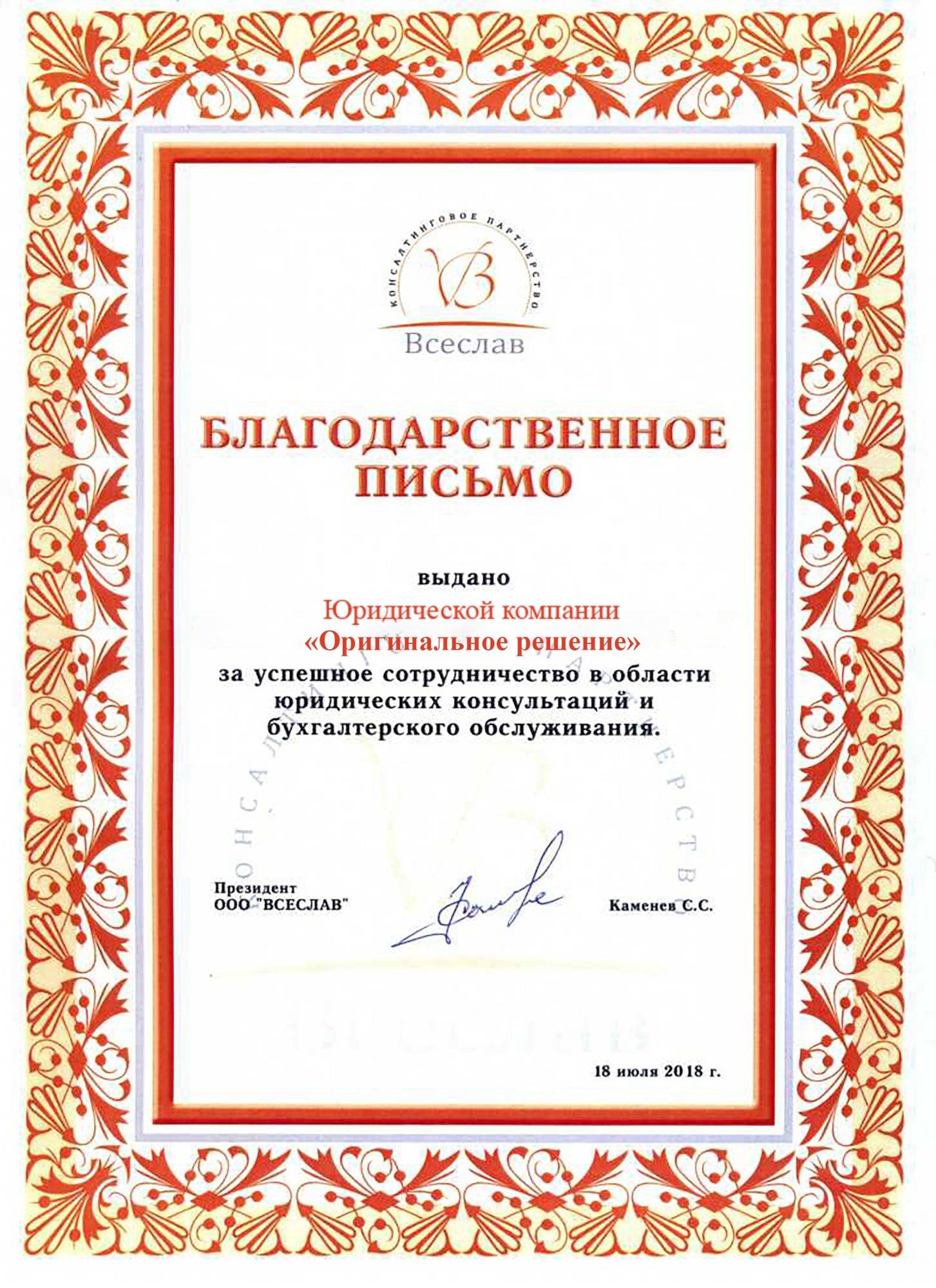 Благодарственное письмо "Всеслав"