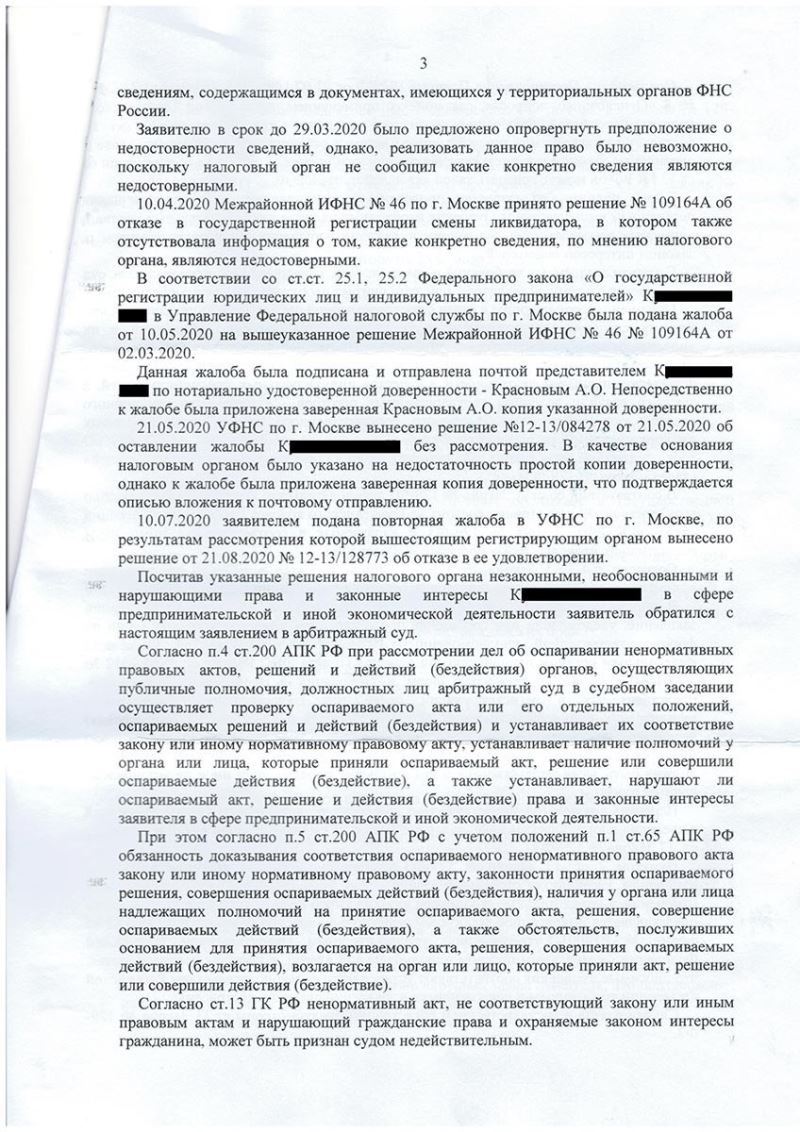 Разработана правовая позиция, согласно которой налоговый орган не имел основания для отказа в смене ликвидатора, подана обязательная досудебная жалоба в вышестоящий налоговый орган, а затем подготовлено и подано заявление в арбитражный суд о признании оспариваемого решения незаконным и обязании налогового органа сменить ликвидатора, также принято участие во всех судебных заседаниях.