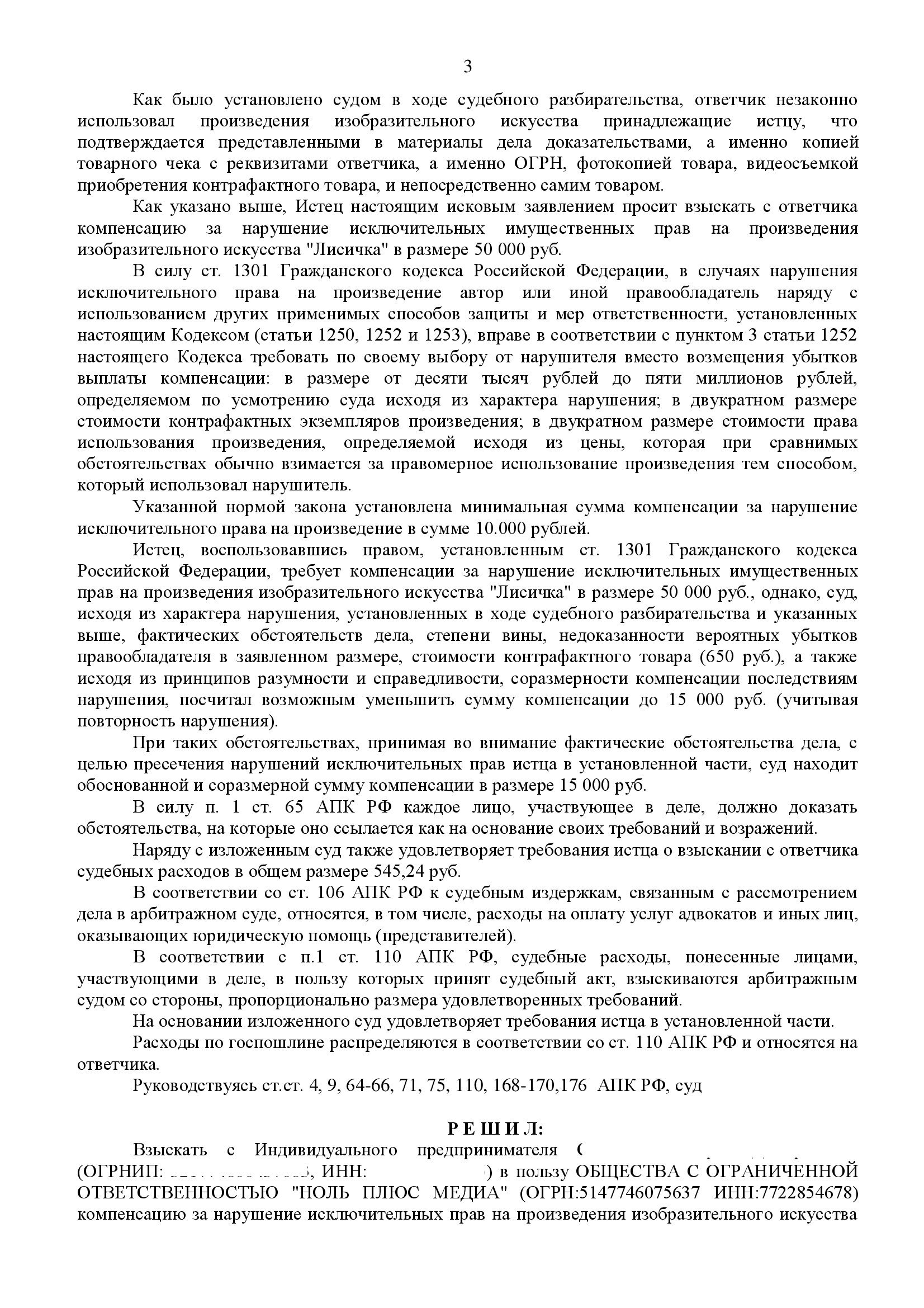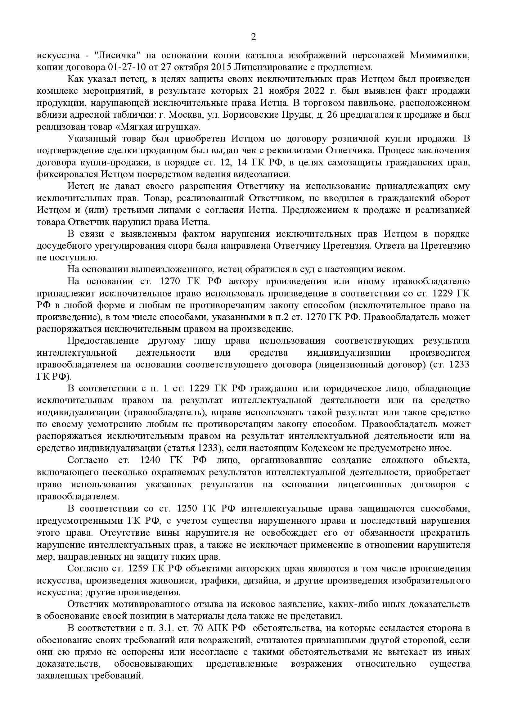 Истец (ООО «Ноль Плюс Медиа») обратился в суд с иском к ИП о взыскании 50 000 руб. компенсации за нарушение исключительных прав на произведение изобразительного искусства — персонажа «Лисичка» из анимационного сериала «Ми-ми-мишки». Основание — продажа 21 ноября 2022 года в торговой точке в г. Москве контрафактной мягкой игрушки. Дело рассмотрено в порядке упрощённого производства.