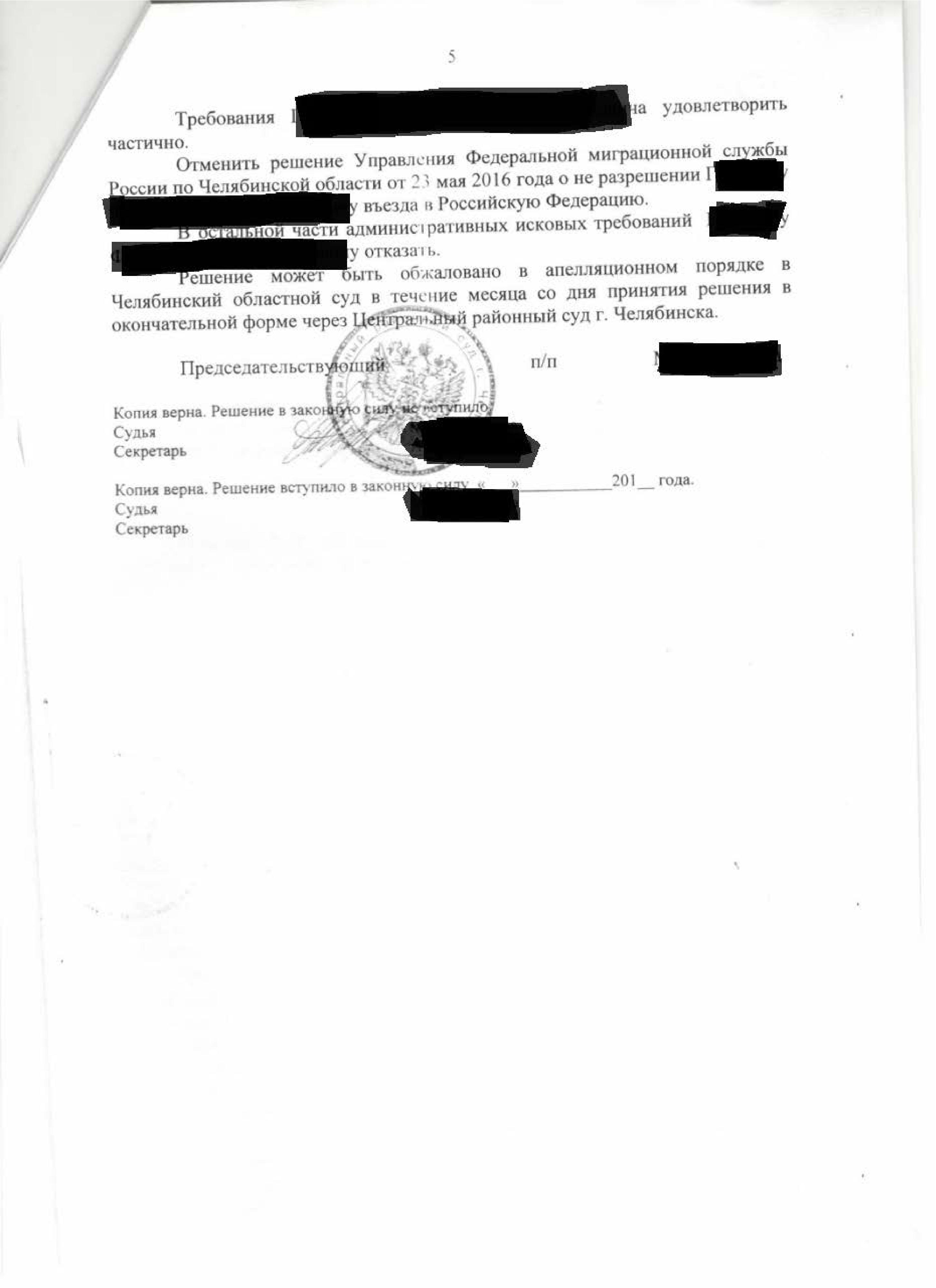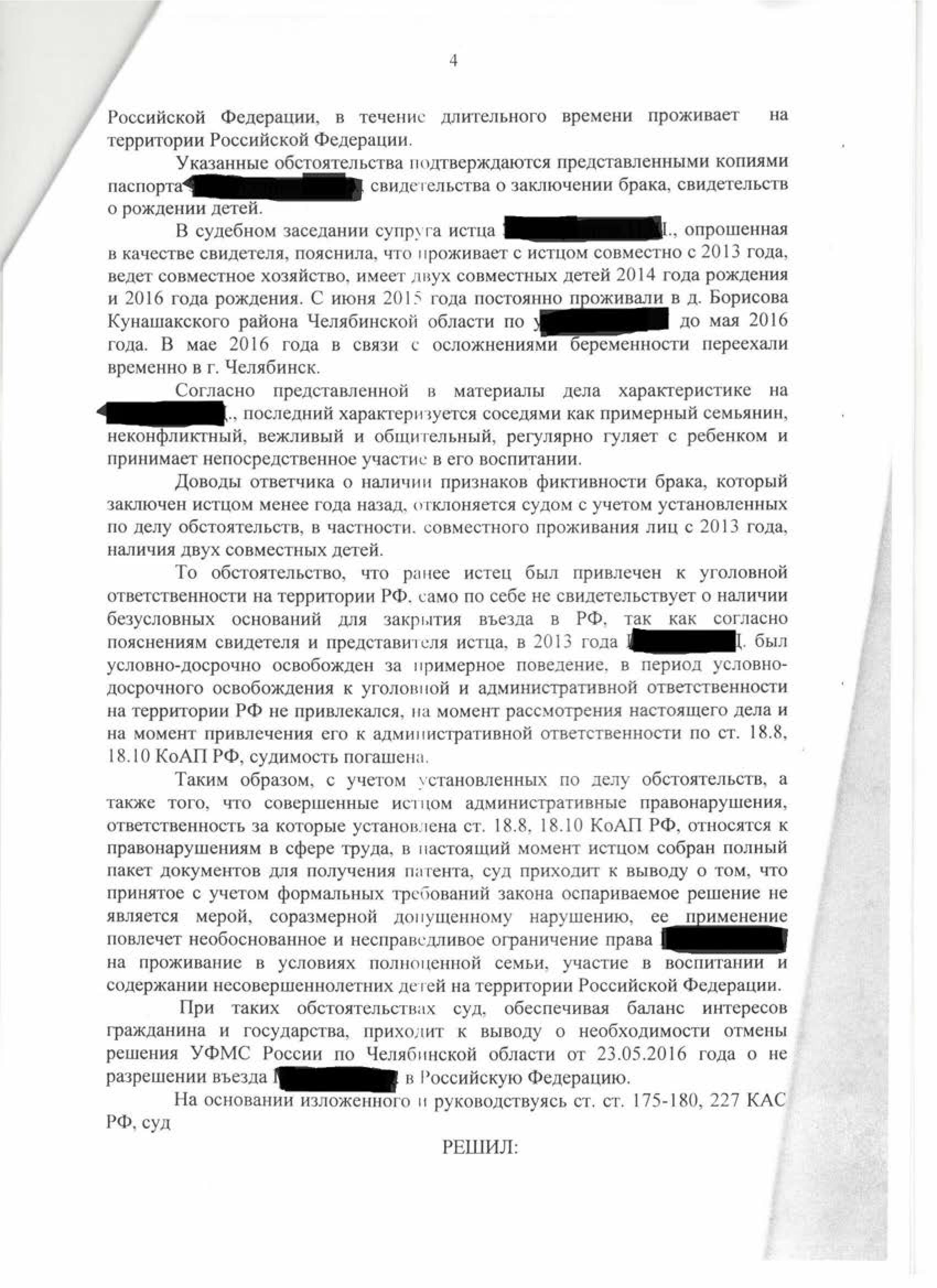 Гражданин Г. обратился в суд с административным иском об отмене решения УФМС России по Челябинской области о не разрешении ему въезда в РФ. Данное решение было вынесено на основании того, что гражданин за время пребывания на территории РФ совершил ряд правонарушений. Требовалось обжаловать данное решение УФМС и признать его незаконным.
