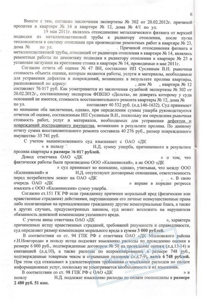 Руководитель нашей компании представлял интересы ответчика – Р.С., проживающего в квартире над истицей. Исковые требования состояли в выплате материального ущерба 76.017 руб., морального ущерба 10.000 рублей, а также в возмещении всех сопутствующих расходов (всего чуть менее 100 000 рублей).