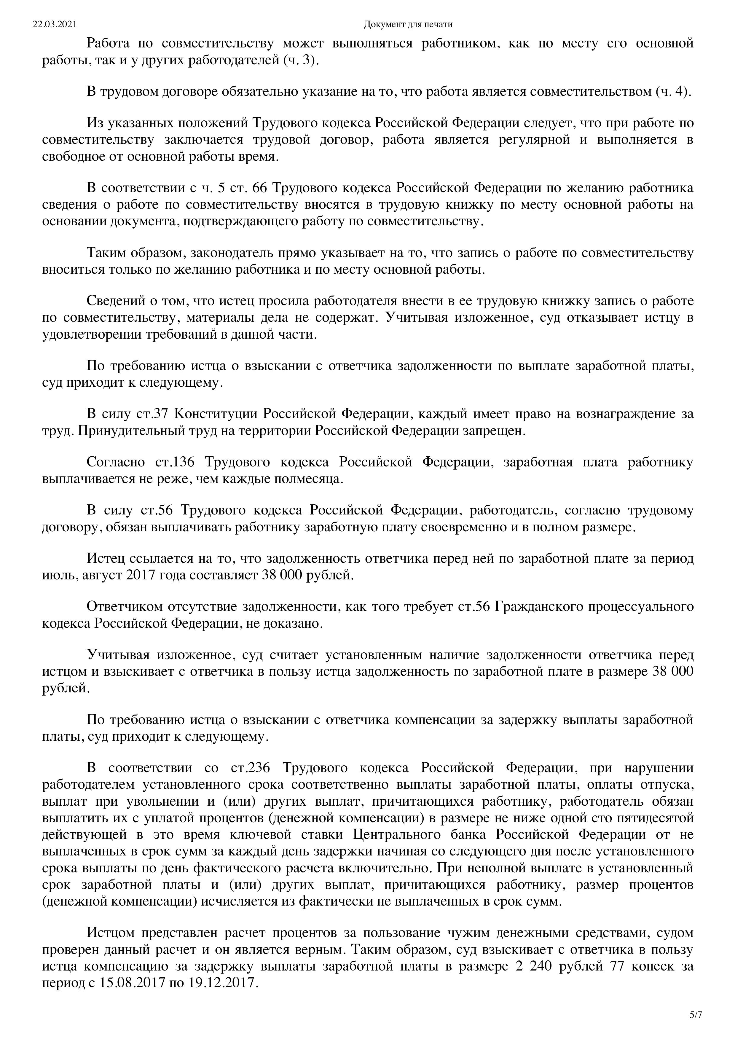 Суд решил: обязать ответчика внести в трудовую книжку запись о приеме на работу; обязать ответчика заключить трудовой договор о принятии на работу; взыскать задолженность по заработной плате в размере 38 000 рублей; компенсацию за задержку выплаты заработной платы 2240 рублей; компенсацию морального вреда 10000 рублей; расходы на оплату услуг представителя в размере 5 000 рублей.
