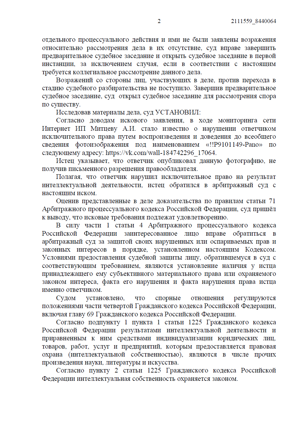 Защитить исключительные права автора на фотографическое произведение и взыскать компенсацию за его незаконное использование муниципальным учреждением в социальной сети «ВКонтакте» без согласия автора и указания источника заимствования.