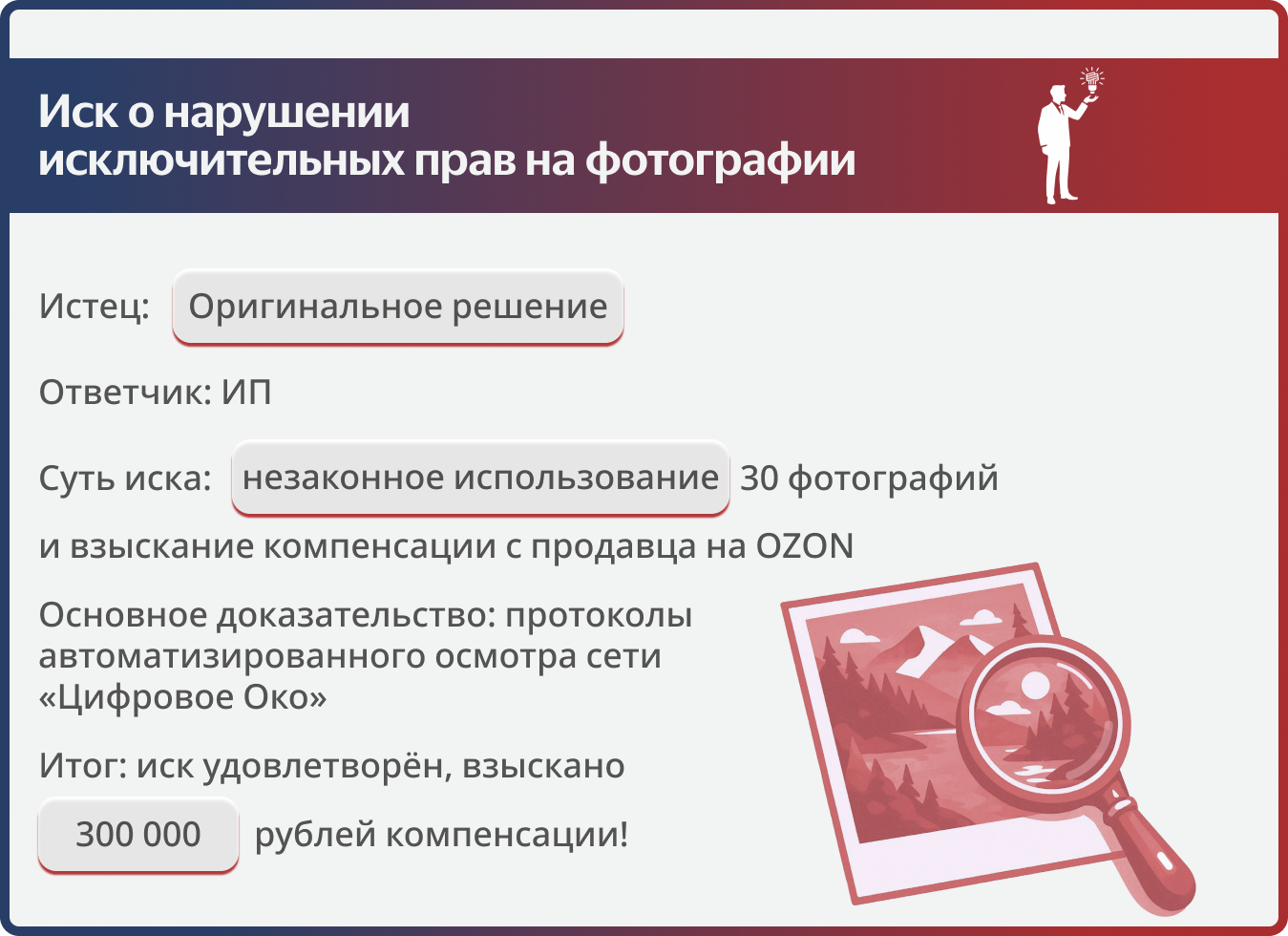 • неоспоримая цифровая фиксация. Для подтверждения факта воспроизведения и доведения до всеобщего сведения 30 фотографий мы использовали Протоколы автоматизированного осмотра информации в сети Интернет (система «ЦИФРОВОЕ ОКО»). Эти документы стали надежной доказательственной базой, принятой судом;