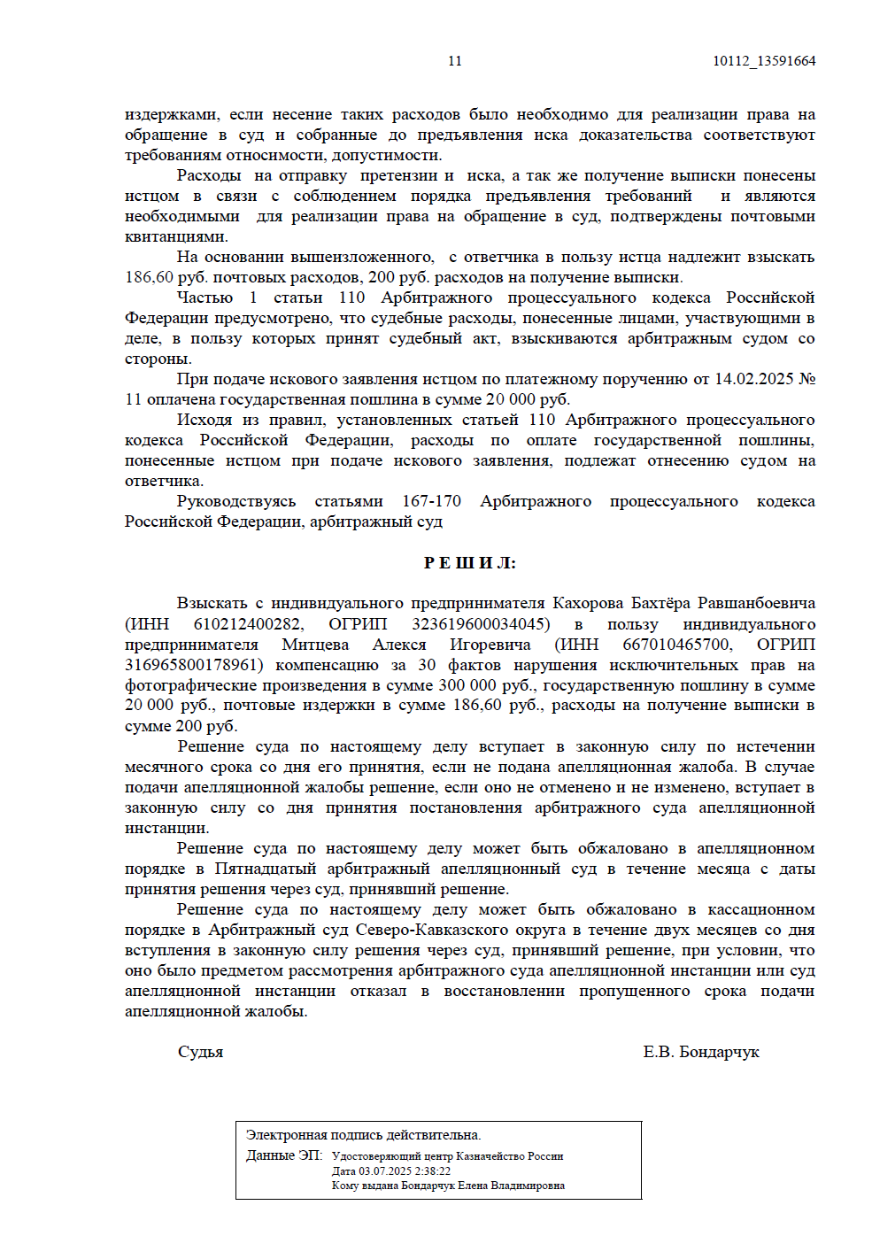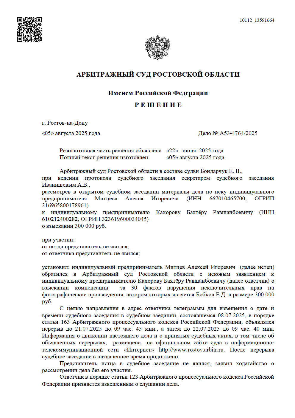 Суд полностью принял нашу позицию, взыскав с нарушителя всю заявленную компенсацию и возместив судебные расходы клиента.
