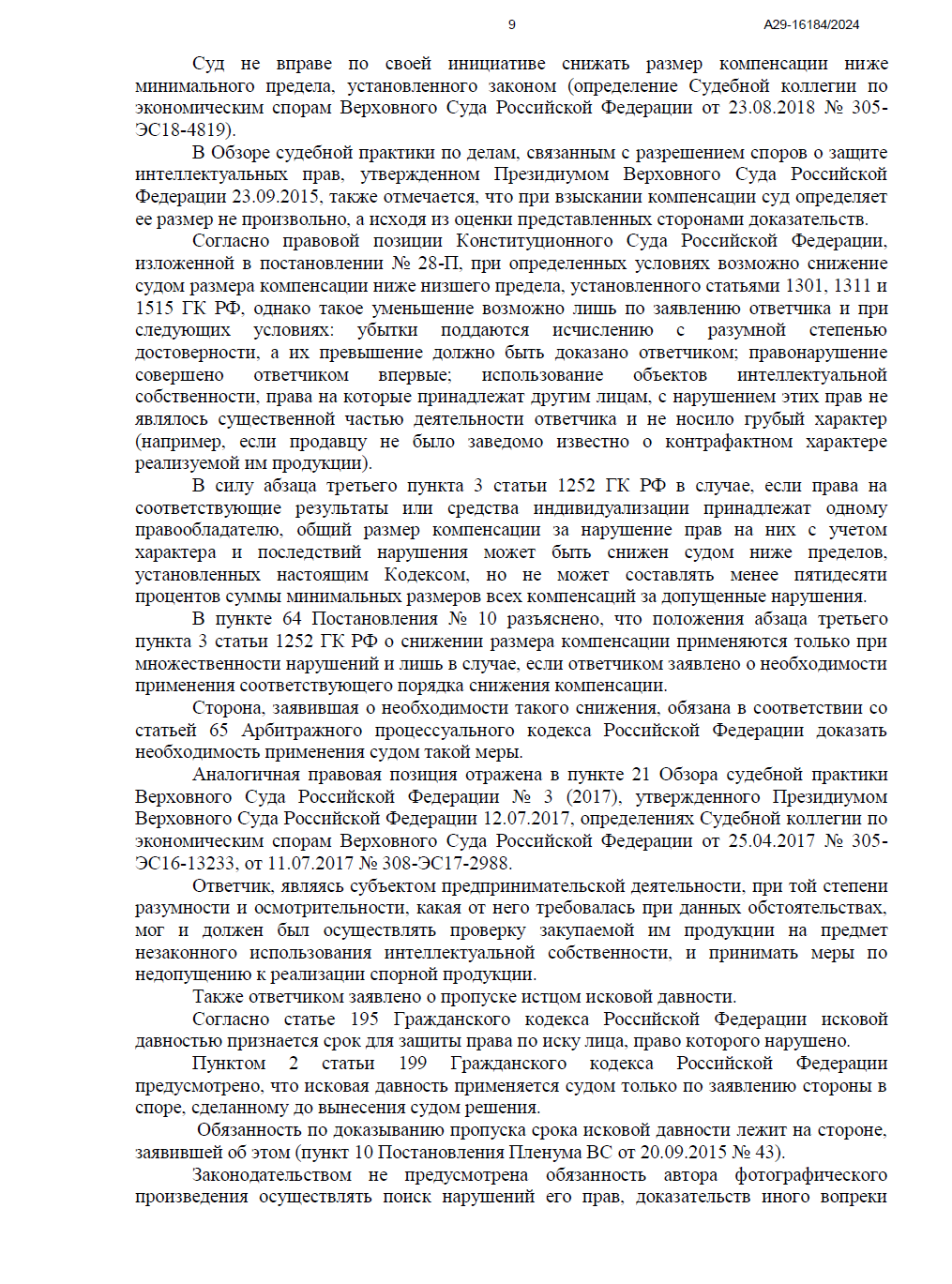 • Согласно закону, срок исковой давности начинает течь не с момента совершения нарушения, а с момента, когда правообладатель узнал или должен был узнать о нем. Мы предоставили суду доказательства, что о нарушении стало известно только 30 марта 2024 года в процессе целевого мониторинга. Суд полностью принял нашу позицию, отклонив довод Ответчика.
