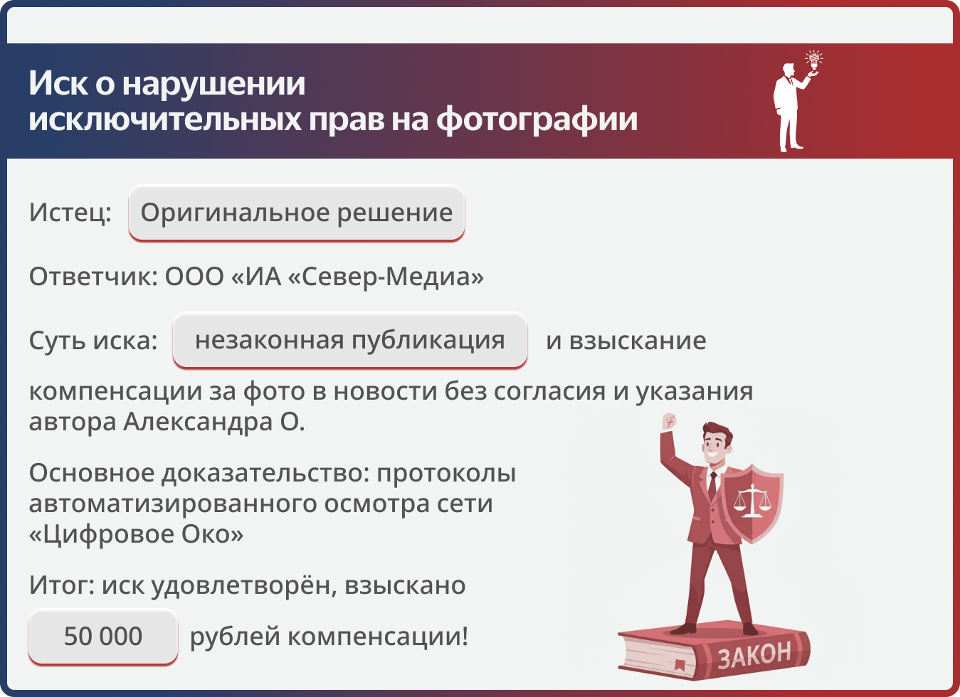• Мы строго применили норму пп. 3 п. 1 ст. 1301 ГК РФ, запросив компенсацию в двукратном размере стоимости права использования. Наш расчет (25 000 руб. за лицензию × 2 = 50 000 руб.) был документально подтвержден. Суд, не получив от Ответчика доказательств более низкой стоимости, утвердил наш расчет в полном объеме.