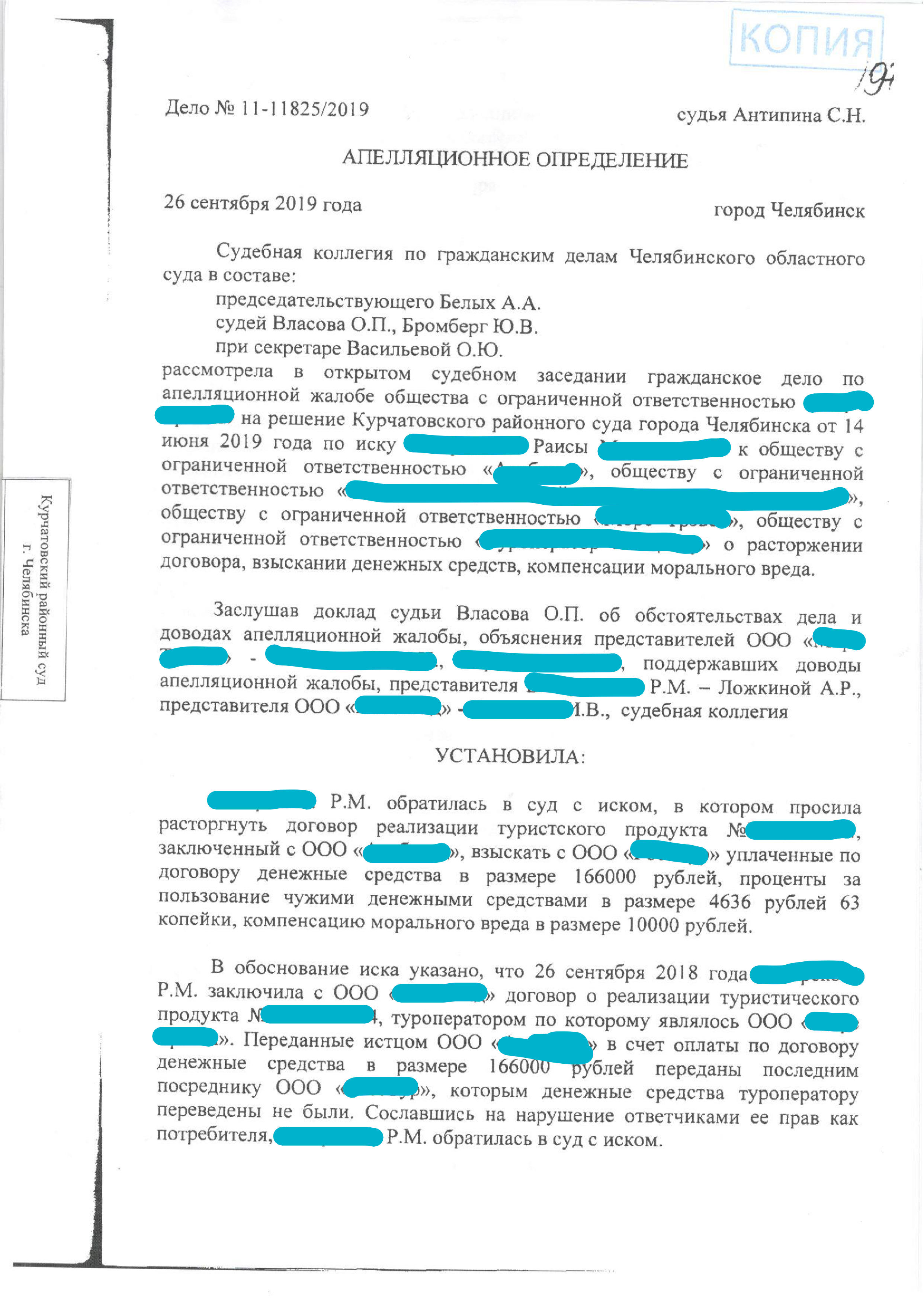 Раиса В. приобрела путевки у туроператора на семью в Эмираты, общей стоимостью 161 019 рублей. Но как оказалось позднее, исполнять обязанности по договору никто и не собирался, как собственно и возвращать деньги. Деньги не маленькие, да и в Арабские Эмираты все также хочется, планы нарушены, настроение испорчено. Раиса В. обратилась к нам за помощью.