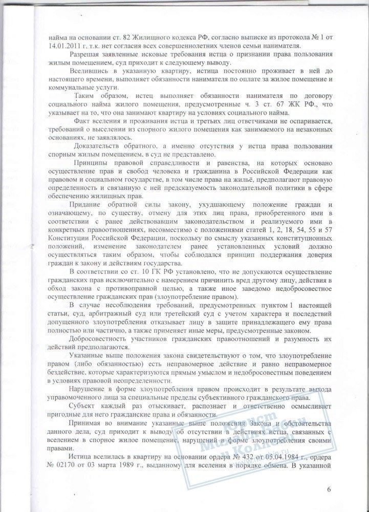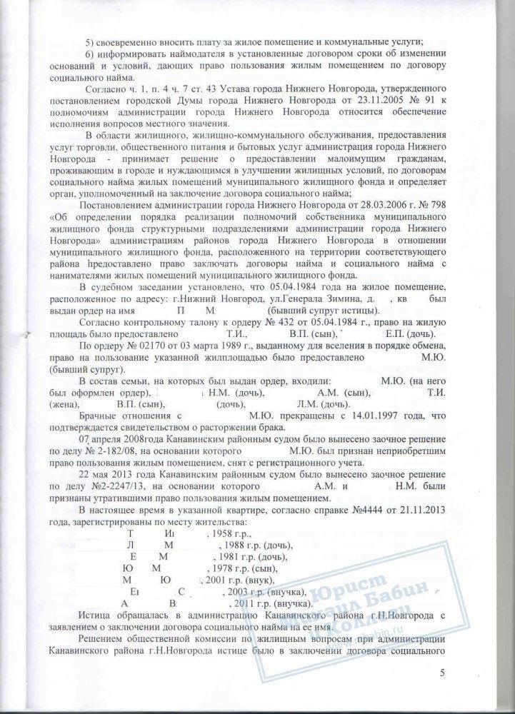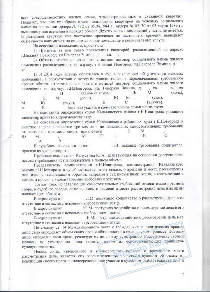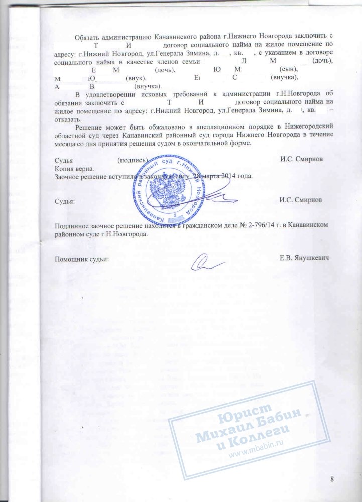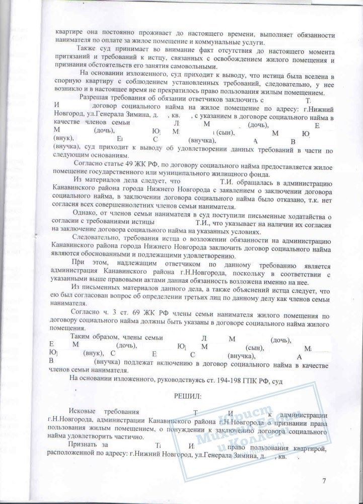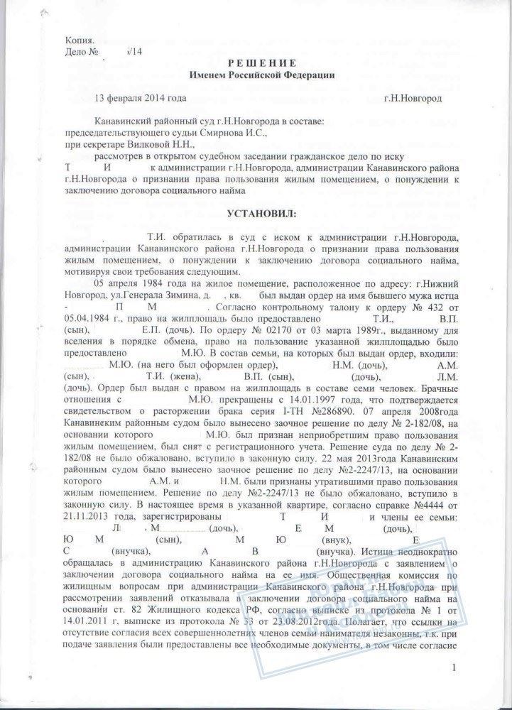 Сотрудницей компании была оказана всесторонняя юридическая помощь в решении данного вопроса. В судебном порядке было признано право Т.И. на жилое помещение. Также суд обязал администрацию заключить с гражданкой Т.И. договор соц. найма, чего она и добивалась.