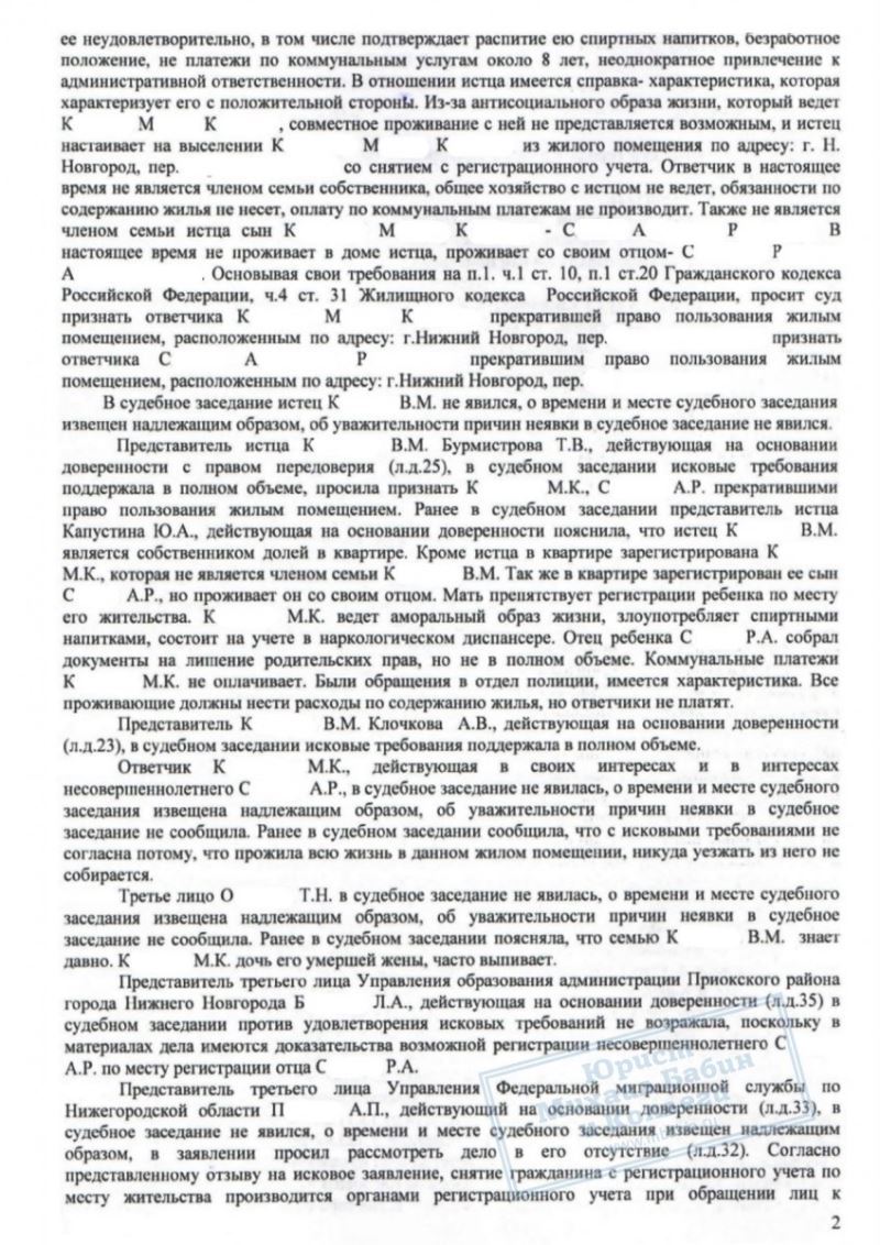 Пенсионер К. в течении 8 лет был вынужден жить в квартире со своей взрослой падчерицей, которая сделала совместное проживание с ней невыносимым. Она регулярно распивала спиртные напитки, приводила мужчин, устраивала скандалы. При этом родственница нигде не работала, и не только не платила за квартиру, но и воровала у пожилого мужчины продукты, которые он покупал на свою небольшую пенсию. К. не мог выселить женщину из квартиры, так как с нею был прописан её несовершеннолетний сын. В опьянении она вела себя агрессивно, так что К. начал опасаться за свою жизнь и здоровье. Потеряв терпение, он обратился за помощью к нашим юристам.